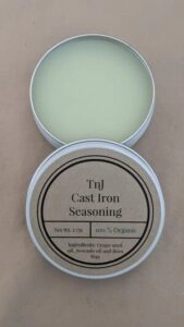 - Spread a thin layer of TnJ’s Cast Iron Seasoning over the skillet.